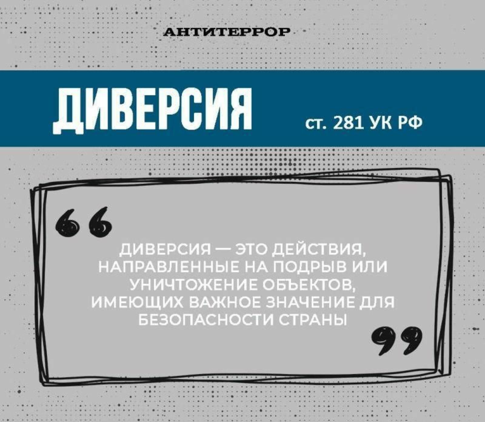 Статья 281 УК РФ "Диверсия", уголовная ответственность с 14 лет, лишение свободы на срок от 10 лет до пожизненного