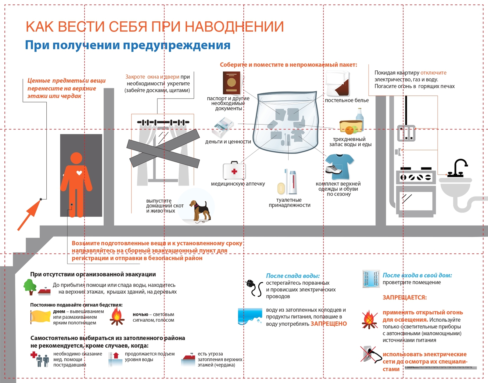 Получив предупреждение об угрозе наводнения (затопления), сообщите об этом вашим близким, соседям, окажите помощь престарелым и больным. В информации будет сообщено о времени и границах затопления, рекомендации жителям о целесообразном поведении и порядке эвакуации.