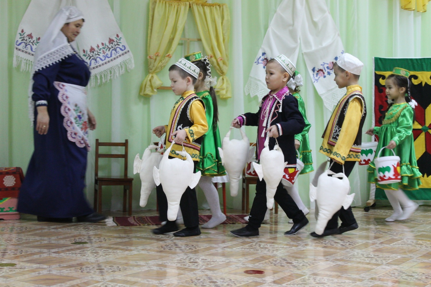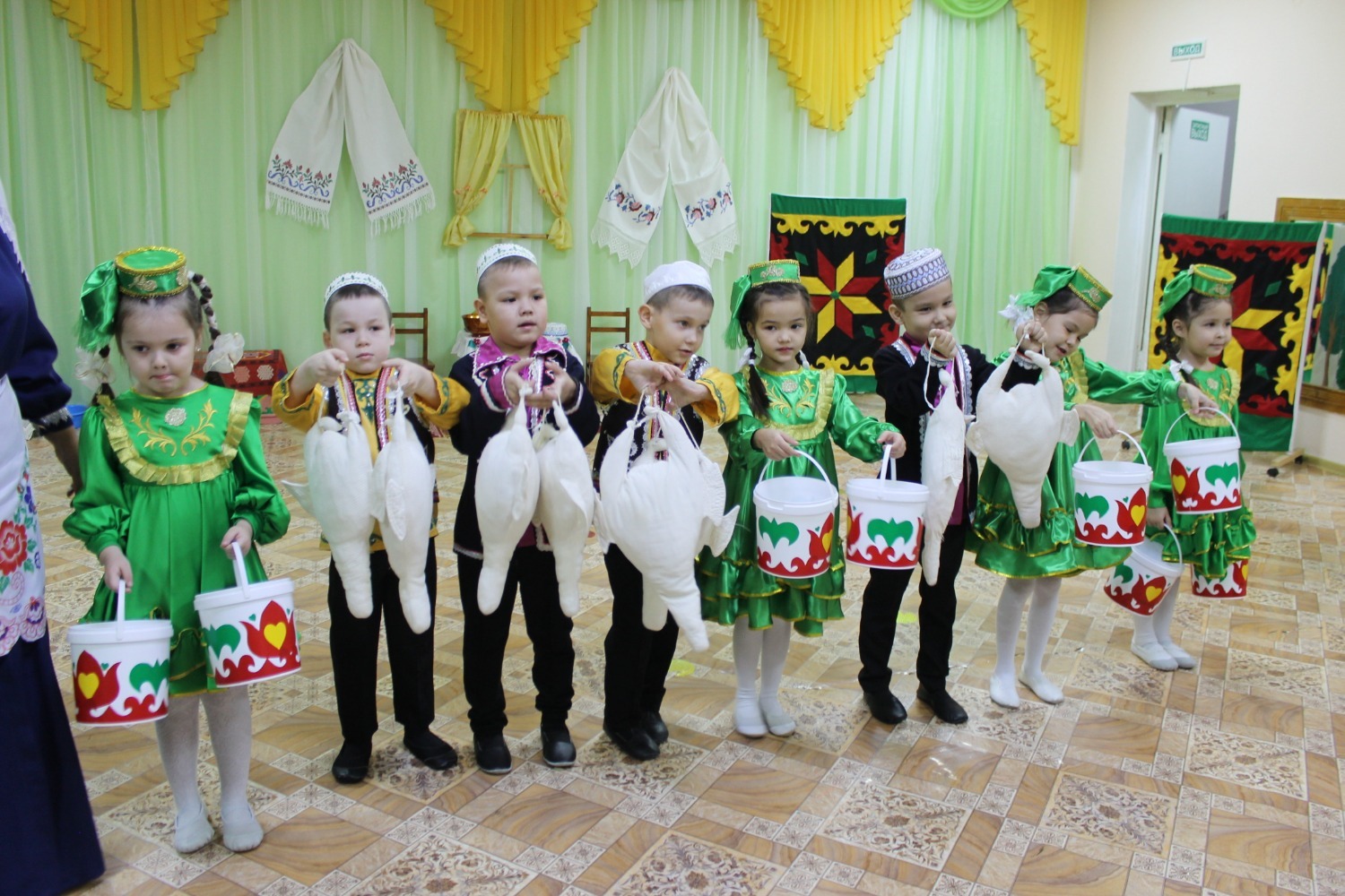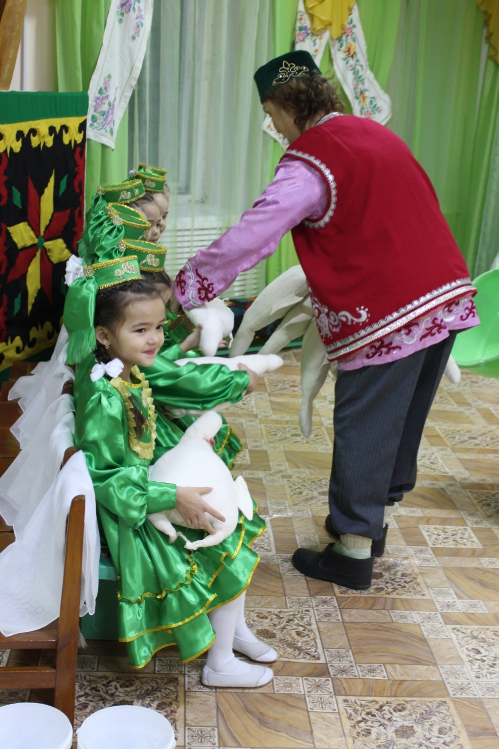 В этот день музыкальный зал детского садика превратился в настоящую татарскую избу. Дети, одетые в яркие национальные костюмы, с первых минут представления перенесли зрителей в мир деревенских посиделок. Девочки пели старинные песни, имитировали процесс ощипывания гусей и рассказывали интересные истории. Их звонкие голоса наполняли зал народными песнями, воспевающими нелегкий, но важный труд. Особое внимание было уделено символическому «ощипыванию» гусей – этот момент, наполненный шутками и смехом, демонстрировал важность каждого этапа подготовки.