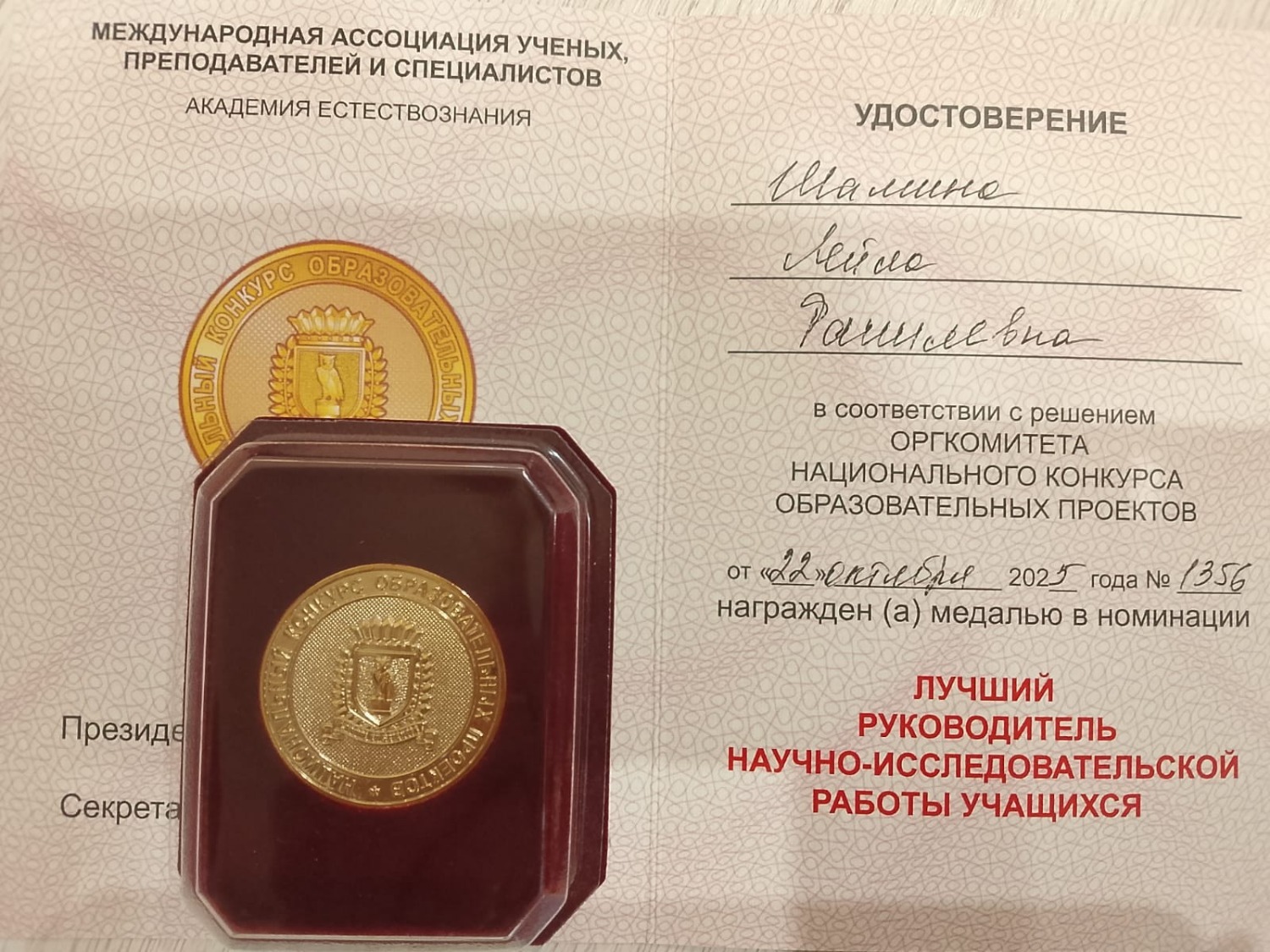 Лейла Шамина на научно-практической конференции «Актуальные вопросы школьного образования», которая проходила в рамках конкурса выступила с докладом «Профессионалитет новая система среднего профобразования, особенности и новые формы обучения». Решением комиссии Российской академии естествознания педагог удостоена Диплома научного руководителя Победителя заключительного очного этапа международного конкурса научно-исследовательских и творческих работ учащихся «Старт в науке», Благодарственного письма Академии Естествознания за руководство научной работой учащихся, Медали в номинации «Лучший руководитель научно- исследовательской работы учащихся» и специального диплома участника конференции.
