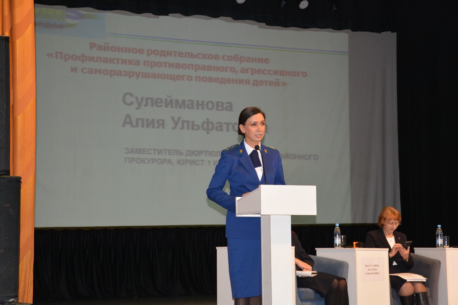 Заместитель Дюртюлинского межрайонного прокурора Алия Сулейманова подняла вопросы необходимости правового воспитания в семье и обратила внимание родителей на высокую меру ответственности семьи в вопросах профилактики аутодеструктивного поведения несовершеннолетних.