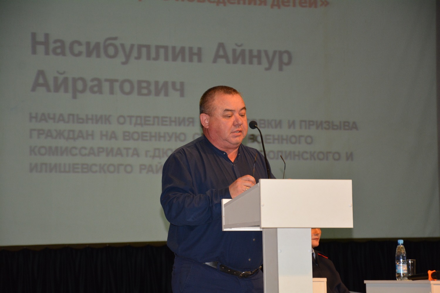 К родителям старшеклассников обратился в своём выступлении начальник отделения подготовки и призыва граждан на военную службу военного комиссариата г. Дюртюли, Дюртюлинского и Илишевского районов Айнур Насибуллин. Он рассказал о правилах поступления в военные высшие учебные заведения и продемонстрировал видеоролик.