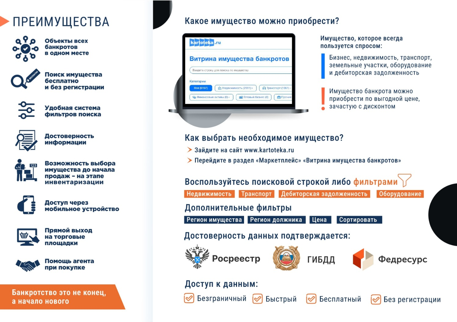 Здесь имущество представлено в понятном виде – с фотографиями, пользовательскими характеристиками, местонахождением и с информацией о том, где и как с ним можно ознакомиться.