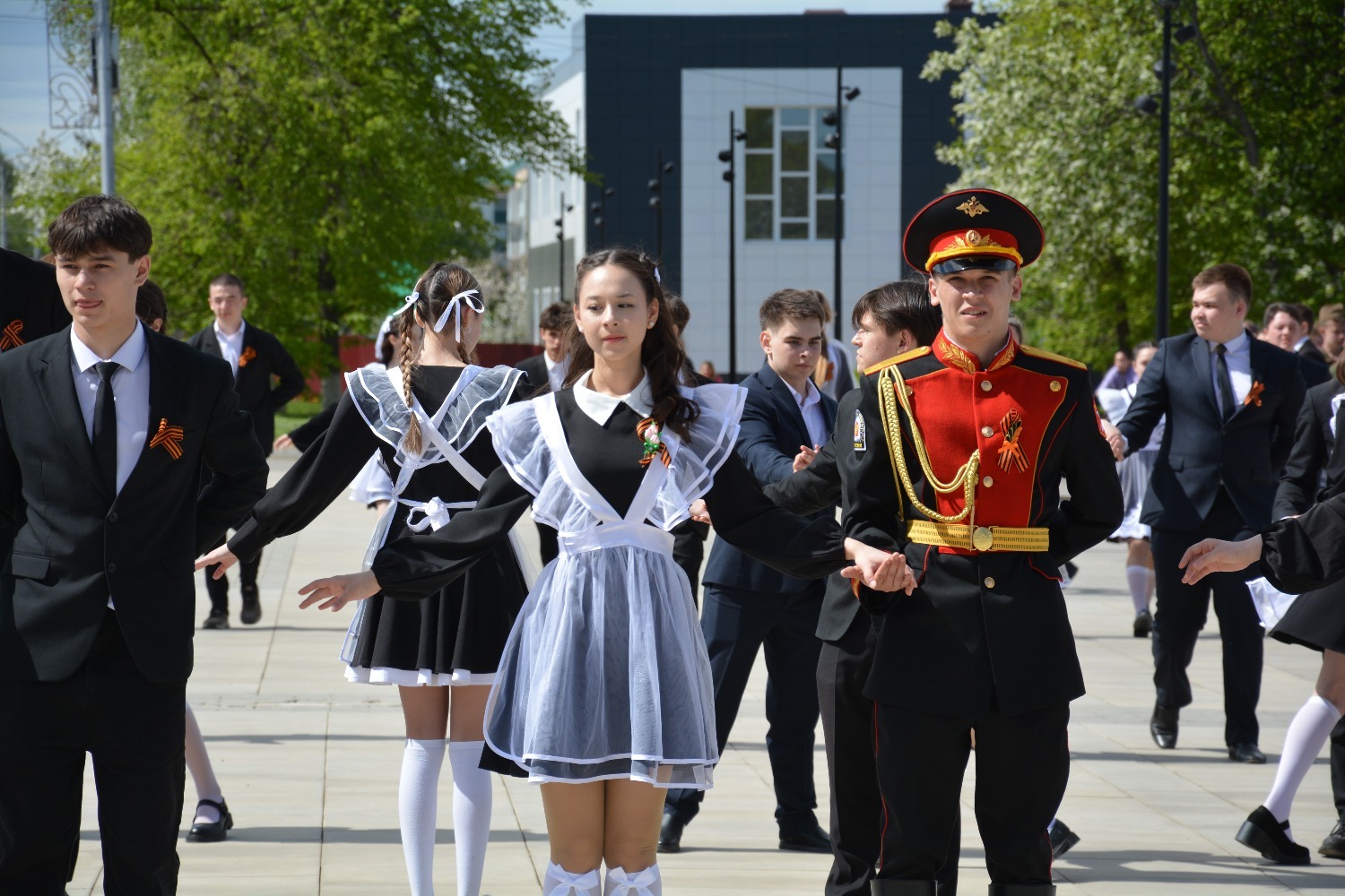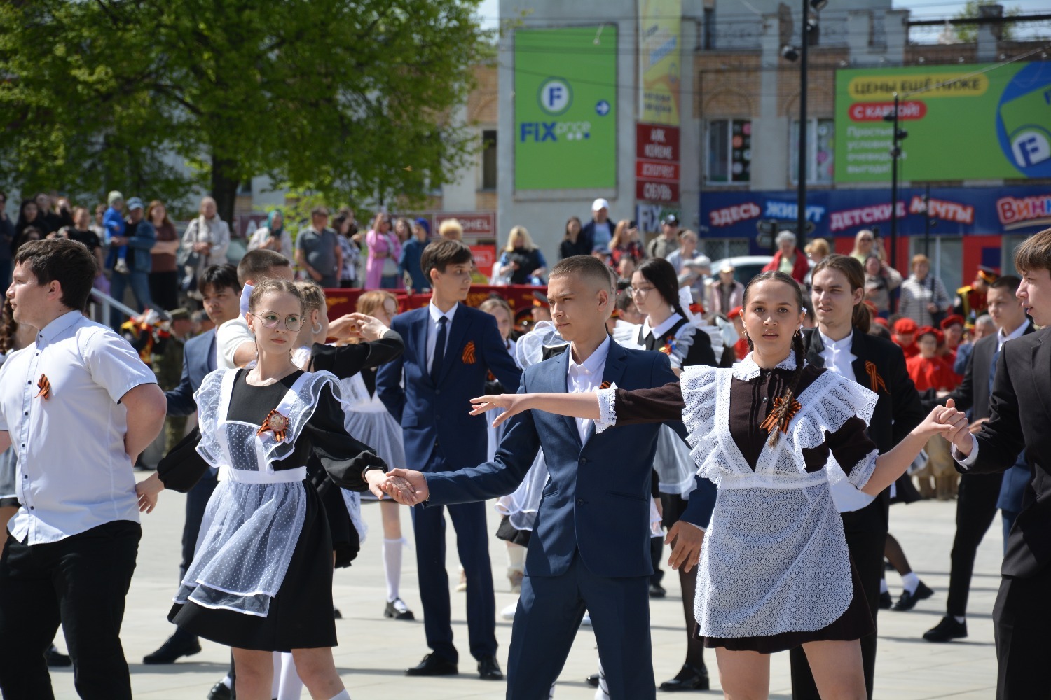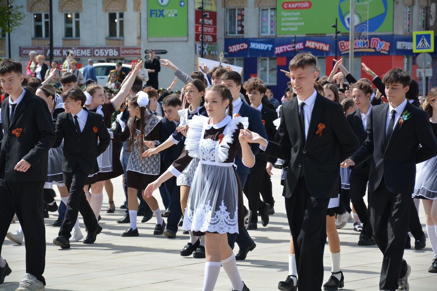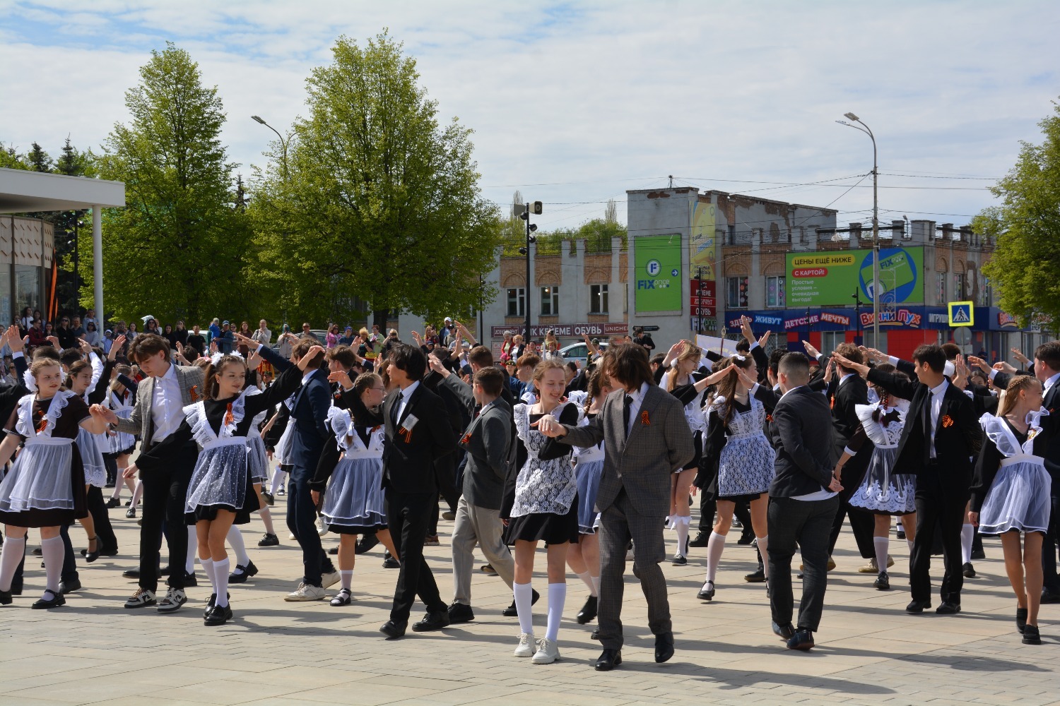 Сегодня на площади им. Ленина 11-классники городских школ приняли участие в танцевальной постановке «Вальс Победы».