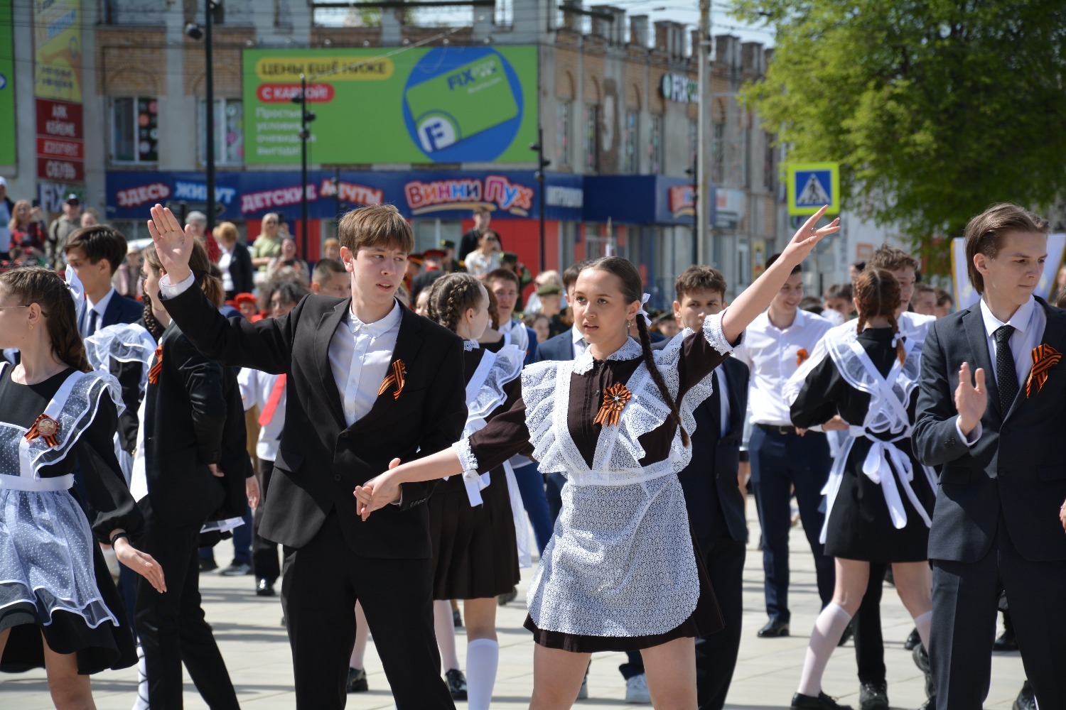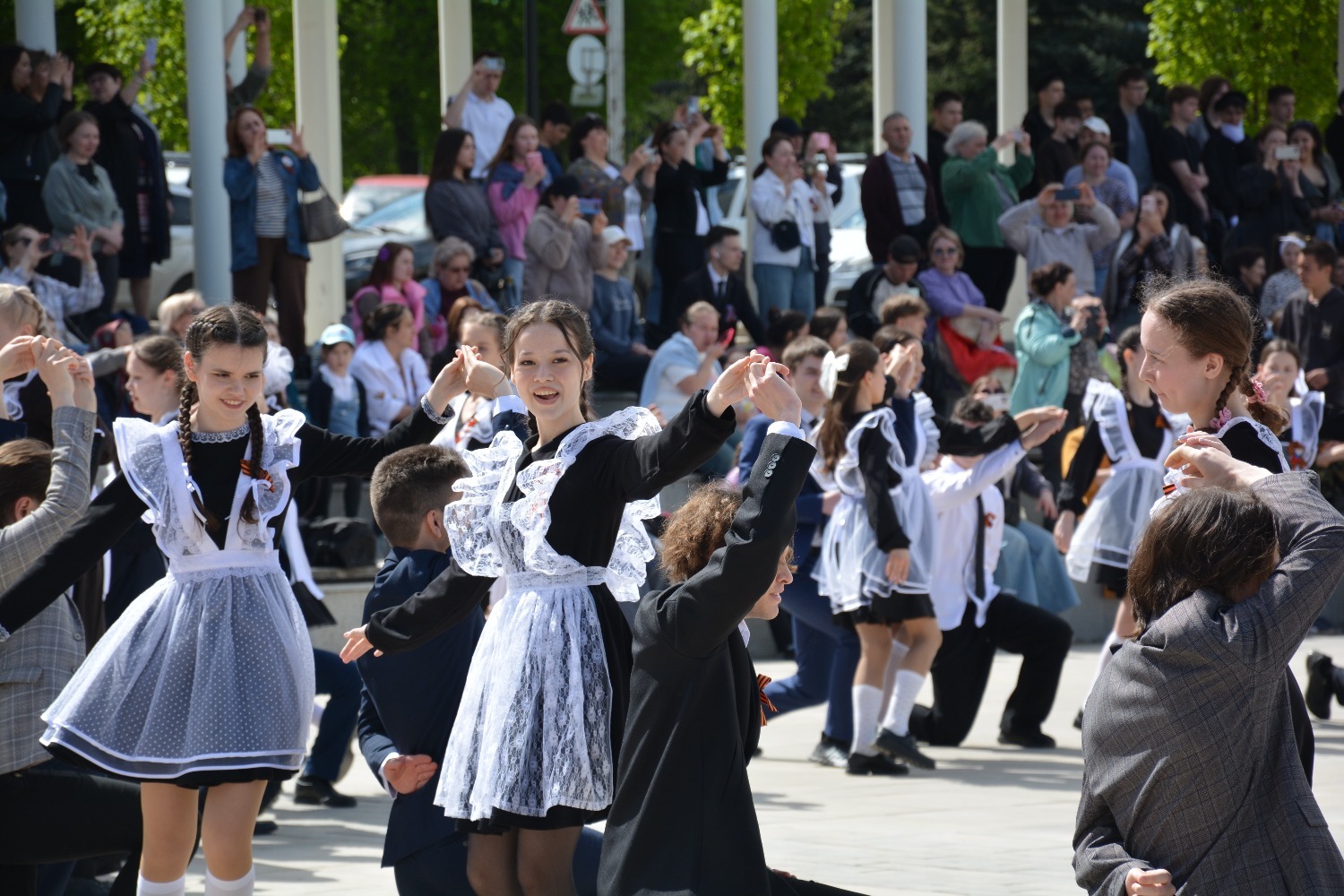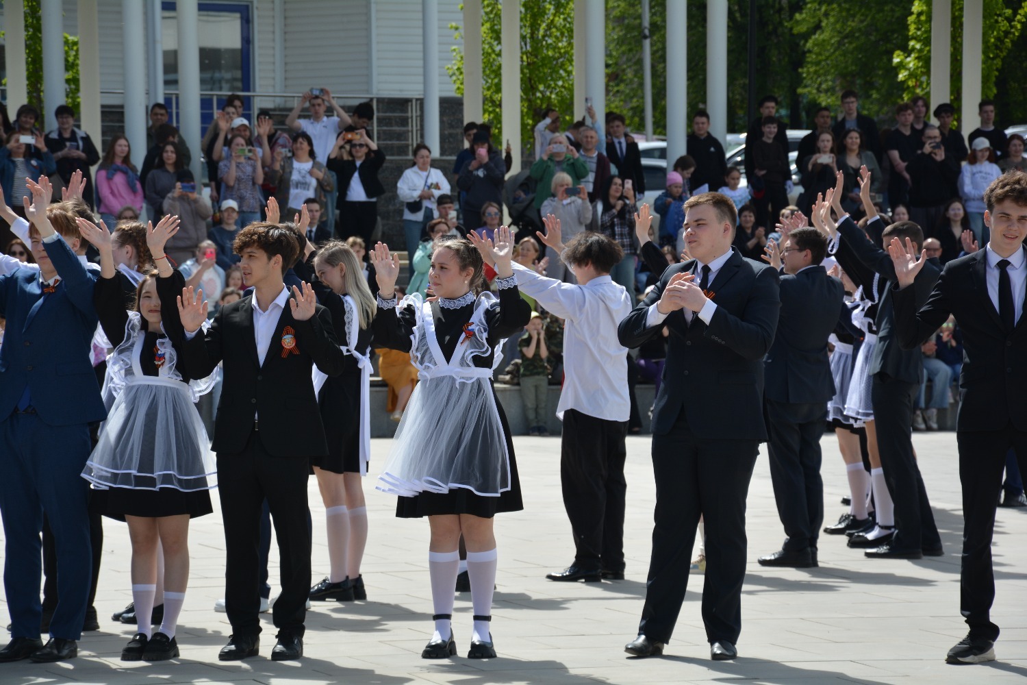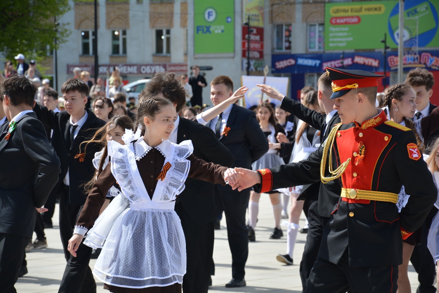 Сегодня на площади им. Ленина 11-классники городских школ приняли участие в танцевальной постановке «Вальс Победы».