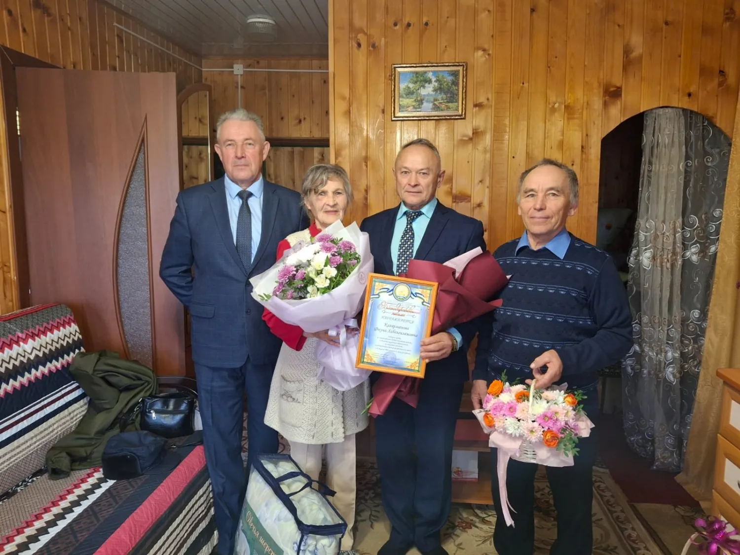 По случаю значимого события делегация посетила ветерана: председатель районного Совета ветеранов Р.М. Вагапов, председатель Дюртюлинской районной организации Профсоюза образования Г.Р. Нуртдинова, а также представители МБОУ СОШ с. Маядык: директор А.В. Камильянов и председатель первичной профсоюзной организации школы М.С. Иляев. Фнуне Хабелгилемовне вручили благодарственное письмо Совета ветеранов, подарки и цветы от районной организации Профсоюза образования и ветеранской организации района.